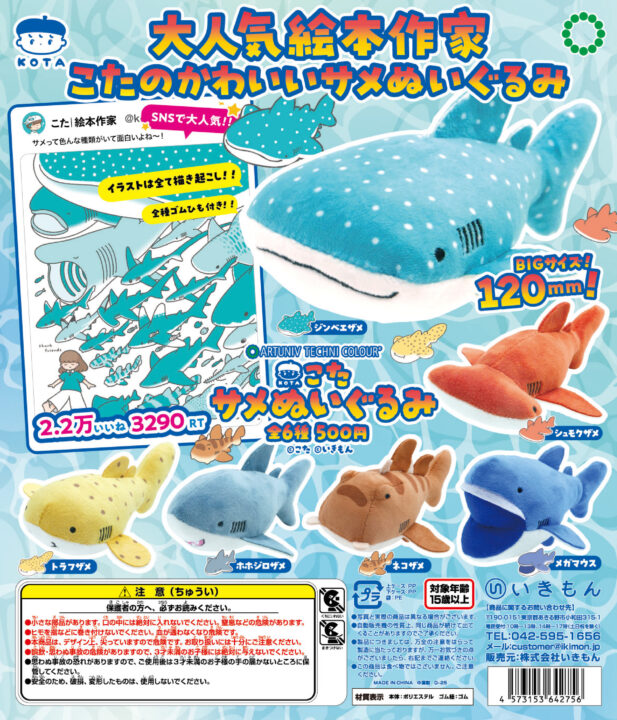 絵本作家・イラストレーターのこた氏が描くサメのイラストたちが、ふわふわの手触りのぬいぐるみになってカプセルトイに登場!こた氏独特の個性的で優しい表情と、本物のサメたちの特徴を捉えた絶妙なデフォルメ感を活かしつつ忠実に再現しました!全種ゴム紐付きのため、バッグやポーチにつけて一緒にお出かけしましょう!